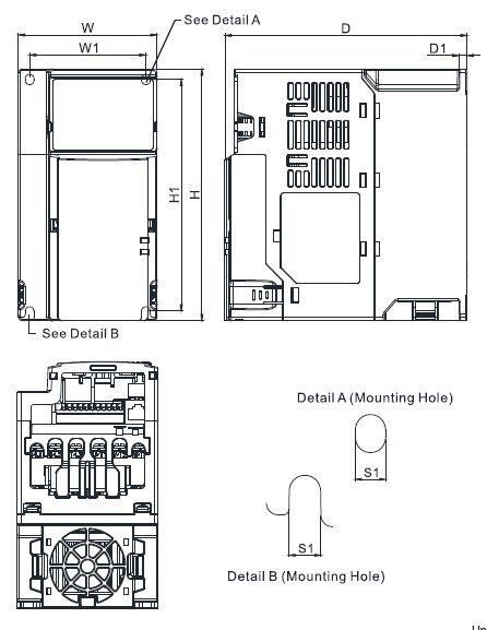 | Dimensions | Delta VFD4A2MS53ANSAA Dimensions |