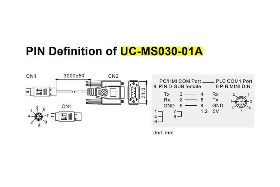 | Connector / Terminal Block | PC (DB9 Female to 8-pin Mini-DIN Male) -> PLC |