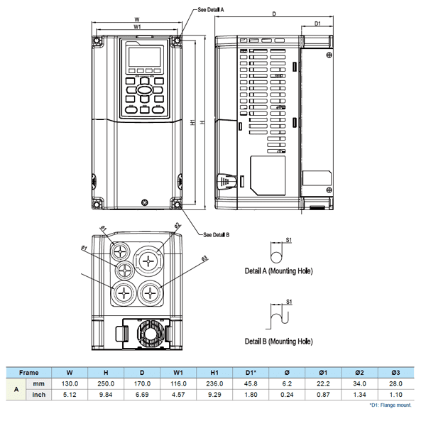 | Dimensions | Delta VFD007C4EA-21 Dimensions |